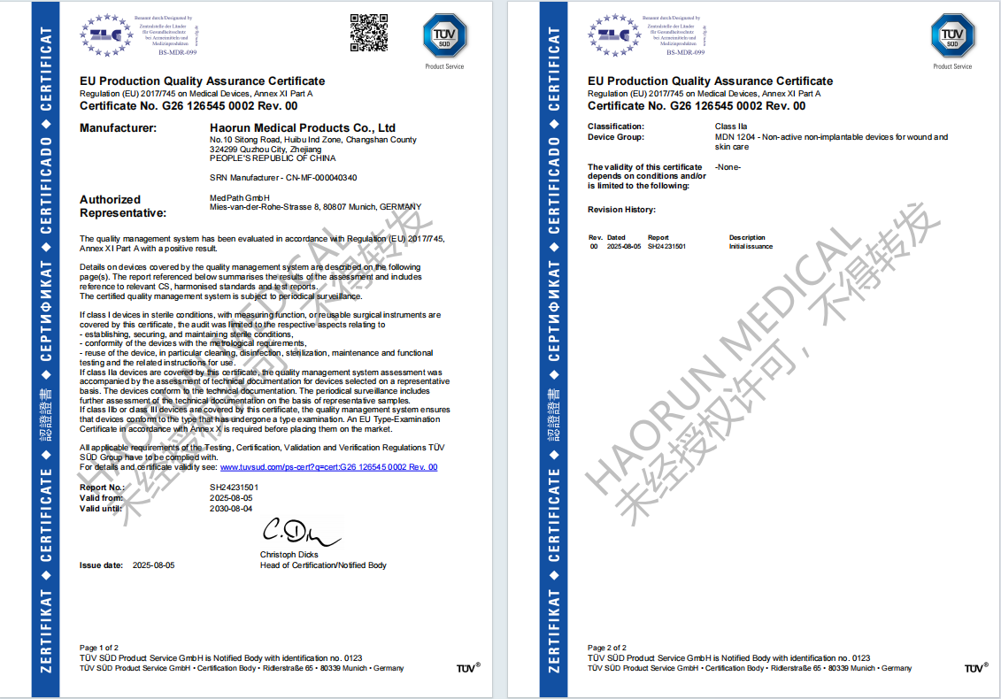 నాణ్యతను మరింత పెంచడానికి, మేము సెప్టెంబర్ 2023 లో మా క్వాలిటీ మాన్యువల్ మరియు విధాన పత్రాల ప్రచురణను పూర్తి చేసాము. దీని ఆధారంగా, మేము జనవరి 2024 లో మా నాణ్యత నిర్వహణ వ్యవస్థ పత్రాలను మెరుగుపరిచాము, MDR- సంబంధిత కంటెంట్ను జోడించాము. మేము ఏప్రిల్ 10, 2025 న టియువి సుడ్ ఆడిట్ యొక్క మొదటి దశలో ఉత్తీర్ణత సాధించాము, ఆపై రెండవ దశ. చివరగా, ఈ సంవత్సరం ఆగస్టులో, మా సర్టిఫికేట్ సంఖ్య నోటిఫైడ్ బాడీ వ్యవస్థలో చూడటానికి అందుబాటులో ఉంది, ఇది హోరున్ మెడికల్ యొక్క నాణ్యత నిర్వహణ వ్యవస్థలో కొత్త అడుగు ముందుకు మరియు సంస్థ యొక్క అభివృద్ధికి సంస్థ యొక్క పునాదిని బలోపేతం చేసింది. మా పునర్వినియోగపరచలేని వైద్య వినియోగ వస్తువులు (గాజుగుడ్డ, గాజుగుడ్డ రోల్స్, గాజుగుడ్డ పట్టీలు మొదలైనవి) ప్రపంచవ్యాప్తంగా వినియోగదారులకు ఉన్నతమైన ఉత్పత్తి నాణ్యత మరియు సేవలను అందిస్తాయి.
